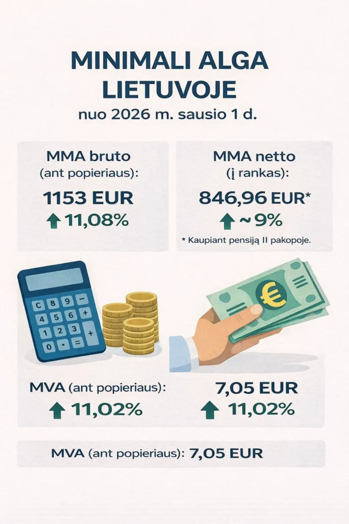 MMA netto (“atlyginimas į rankas”): 846.96 Eur. (kaupiant pensiją II pakopoje).